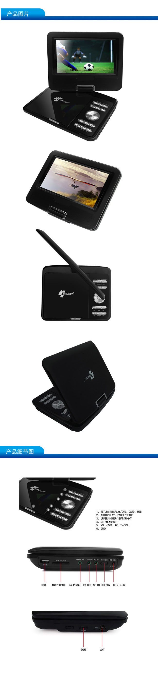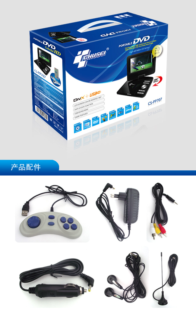 主要参数一般描述:7.0”便携式PDVD屏幕尺寸:7.0”LED大屏幕背光类型:白光LED媒体:DVD+ R / W,DVD- R / W,DVD,CD - R,CD - RM,VCD,SVCD,PHOTO - CD,JPEG,MP3,MP4,DIVX,输入插槽:A)SD / MMC / MSB)的USB视频:是音频:是数字解码器:杜比数字AC -3视频输出:视频输出音频输出:A)内置立体声扬声器B)立体声线路输出C)耳机输出输出功率(PMPO):2W× 2