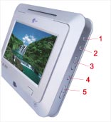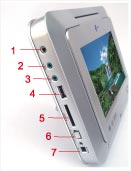 1.Headphones 2.COAXIAL 3.AV OUT/IN 4.USB 5.SD/MMC/MS 6.ON-POWER-OFF 7.DC IN 9V
