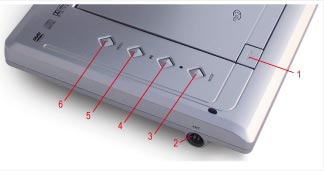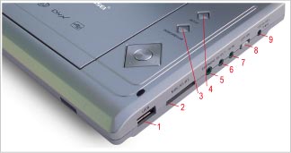 1.USB 2.MMC/SD/MS 3.DVD/CARD/USB 4.SETUP 5.EARPHONE 6.AV  OUT 7.AV IN 8.OFF/ON 9.DC-IN 9.5V 1.OPEN  2.ANT 3.MODE 4. 5. 6.MENU